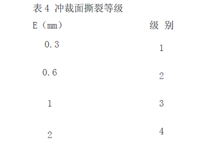 精沖零件沖裁面撕裂等級(jí)分為四個(gè)級(jí)別(見(jiàn)表4)。